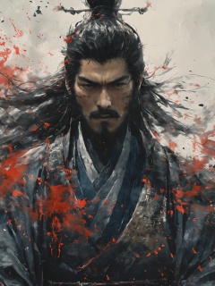 ananmo, 1boy, male focus, solo, facial hair, beard, manly, black hair, blood, samurai, armor, helmet, looking at viewer, mustache, upper body