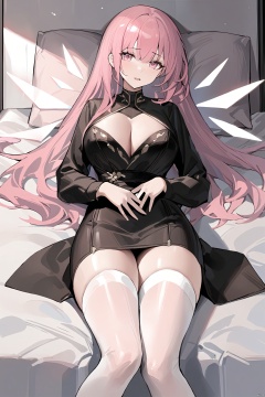 (masterpiece),(best quality),1girl, long_hair,(large_breasts:1.2),solo, pink_hair,pink_eyes,energy_wings,holo,white_thighhighs,black_dress, leimiuan,facing_viewer,lying,bed,no_shoes,feet,(full_body:1.2),