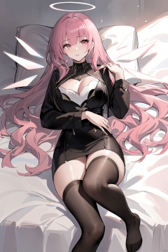 (masterpiece),(best quality),1girl, long_hair,(large_breasts:1.2),solo, pink_hair,pink_eyes,energy_wings,holo,black_thighhighs,dress, leimiuan,facing_viewer,lying,bed,no_shoes,feet,(full_body:1.2),