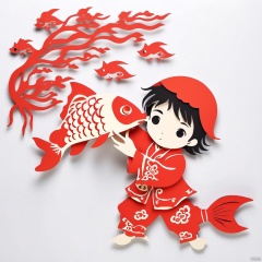 paper-cut,fish, solo, holding animal, 1boy, long sleeves, profile, black hair, male focus, short hair, red jacket, holding, animal, child, jacket, traditional media, black eyes, upper body, male child, red shirt, branch, goldfish, cowboy shot, white background