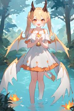 <lora:kohaku-xl-delta-lyco-step00028000:1.0>1girl,(fukuro daizi:1.1), kz oji, (henreader:0.9), (ask \(askzy\), aki99, ama mitsuki, ciloranko:0.9), kaede \(sayappa\),masterpiece, newest, absurdres, solo, dragon girl, dragon tail, dragon wings, dragon horns, white dress, long hair, side up, river, tree, forest, pointy ears, 1girl, :3, angel wings, bell, blonde hair, blue background, blue hair, blush, breasts, collarbone, dress, eyes visible through hair, fang, fire, full body, hair between eyes, horns, looking at viewer, nature, off shoulder, open mouth, orange eyes, outdoors, smile, tail, twintails, wings