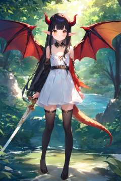 <lora:kohaku-xl-delta-lyco-step00028000:1.0>1girl,(fuzichoco:1.1), (torino aqua:0.8), (modare:0.8),(ask \(askzy\):1.1), (yoneyama mai:1.3),masterpiece, newest, absurdres, solo, dragon girl, dragon tail, dragon wings, dragon horns, white dress, long hair, side up, river, tree, forest, pointy ears , bare shoulders, belt, black hair, black thighhighs, blush, breasts, brown eyes, cleavage, closed mouth, dress, elf, flat chest, full body, horns, looking at viewer, multicolored hair, nature, outdoors, parted lips, red hair, short dress, small breasts, standing, sword, tail, thighhighs, very long hair, weapon, wings, dark theme