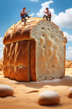 masterpiece,best quality,<lora:微缩世界-美食版>,miniature photography,a bread with two people on top of it and some wheat stalks in the background with a sky background,
