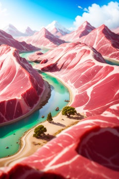 masterpiece,best quality,<lora:微缩世界-美食版:0.9>, miniature  photography,the mountains and rivers formed by meat,