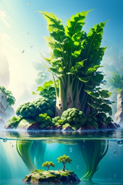 masterpiece,best quality,<lora:微缩世界-美食版>,a painting of a group of green plants floating in water with a small island in the middle of the picture,