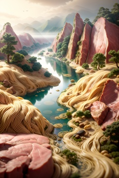 masterpiece,best quality,<lora:微缩世界-美食版:0.8>, miniature  photography,the river of noodles,a mountain formed by meat,the mountain formed by bread,