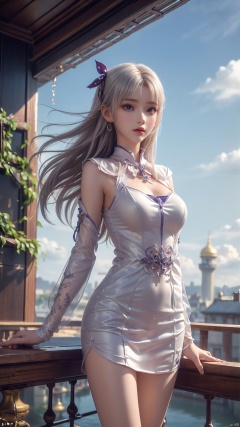 (girl inside of floating city:1.3), (1 girl away from camera:1.2), (Super wide Angle lens), Holy Light, white dress, (full body), bare feet, solo