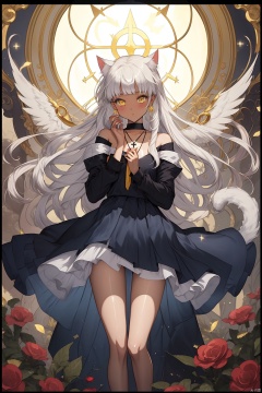 {masterpiece},white hair,yellow eyes,aqua eyes,looking up,stockings,dark skin,long hair,hime cut,messy hair,floating hair,demon wings,halo,cross necklace,holy,divinity,shine,holy light,cat girl,(loli),(petite),solo,cozy anime,houtufeng,letterboxed,1 girl,2Dconceptualdesign负向提示<lora:EMS-6531-EMS:0.000000>, <lora:EMS-48782-EMS:0.400000>, <lora:EMS-7779-EMS:0.400000>, <lora:EMS-33085-EMS:0.500000>