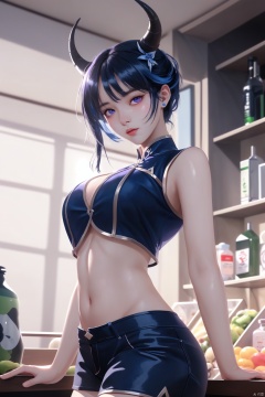 (masterpiece:1.2),best quality,high resolution,unity 8k wallpaper,(illustration:1),perfect lighting,extremely detailed CG,finely detail,extremely detailed,soft lighting and shadow,soft yet striking lighting,film grain:1.2,(skin pores:1.2),(detailed skin texture:1),((solo:1.5)),Detailed face,(see-through:1.1),misty,Low Key:1.1,depth of field,crop top,shorts,makeup,indoors,supermarket, large breasts,ganyu \(genshin impact\), 1girl, blue hair, horns, solo,looking at viewer,purple eyes, bangs