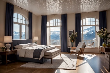 a bedroom photo for test cgart mayfly (model) , modernist style, bed, pillows, flowers, vase, table, sofa, books, flower pots, ornate ceiling lamp, table lamp, chair, curtains,BREAK, panoramic glass window with snow-covered mountains outside, morning sunlight pouring through the window onto the floor, shadows