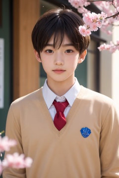 1boy,solo,upper body, looking at viewer,school uniform,peach blossoms, falling petals,