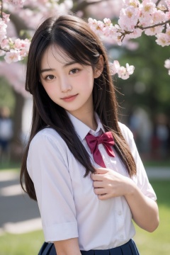 1girl,solo,upper body, looking at viewer,school uniform,peach blossoms, falling petals,