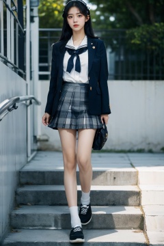Ultra-realistic 8k CG,masterpiece,best quality,(photorealistic:1.4),HDR,absurdres,Professional,RAW photo,lens flare,(film grain:1.1),Bokeh,((Depth of field)),studio light,a young girl in a uniform while standing on steps with a railing in the background, 1girl, black_hair, long_hair, pleated_skirt, sailor_collar, serafuku, school_uniform, shoulder_bag, skirt, solo, stairs, Highly detailed,Professional,extreme detail description,skateboard park, tricks, (freestyle:1.2), (youth culture:1.1), concrete ramps, graffiti,blurry<lora:EMS-309664-EMS:0.900000>, <lora:EMS-261843-EMS:0.600000>