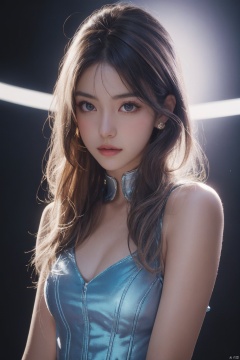 rich colors,(upper body:1.2),high gloss,extremely beautiful skin,natural skin texture,(pale skin, real_skin),(Milky skin:1.2),(shiny skin:1.4),orange background,cinematic light,fantasy,highres,highest quallity,eyes with light,model pose,Stiletto Boots,professional lighting,large aperturing,atmosphere,candid shots,neon lighting,hologram dress with blue and purple fabric,transparent/translucent medium,photorealistic,(1girl:1.7),(20yo:1.5),