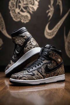 (best quality,8K,highres,masterpiece), ultra-detailed studio photography showcasing a cutting-edge sneakers design. The image features sleek black footwear with intricate tattoo-like patterns, set against a blurry background that adds depth of field and enhances the focus on the shoes. The blurred background creates a sense of mystery and intrigue, drawing attention to the details of the sneakers. This artwork captures the fusion of fashion and artistry, presenting a visually captivating composition that is both stylish and enigmatic.