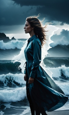 Double exposure photography, A portrait that merges a human silhouette with a stormy seascape, suggesting a tumultuous inner state. The blending of the two images creates a powerful metaphor for emotional depth and turmoil. The dynamic waves and the serene pose of the silhouette offer a stark contrast, enhanced by dramatic lighting and a moody color palette.