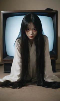 horror movie, yamamura sadako, ghost crawling out of a small static lighting CRT television like through a portal,  lighting screen,face to viewer, (crawling pose),large livingroom with furniture, both hands on the floor, bending over in crawling pose with two hands press on the floor , Evoking the dread of "Ju-on" and "The Ring,"super long black hair,A face marred by decay, festooned with wounds, and eyes bearing the scars of burns,wearing white robe, ,,bending over from the tv screen frame, ugly, hatred expression,,creepy look, ((An old water well and forests shown in the lighting tv screen frame)). an eerie glow emanates from the television screen, casting sinister silhouettes across the walls. begins her haunting emergence. Half-emerged, her spectral fingers grip the ground, blurring the lines between the digital and the physical,  <lora:LCM_LoRA_Weights:1>