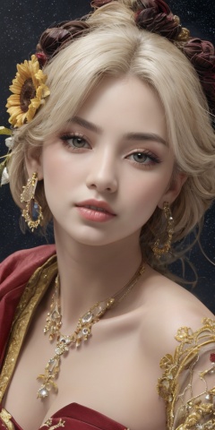 1girl,Han Chinese girls,sparkle,yellow Hanfu,chinese clothes,large breasts,sunflower,jewelry, earrings,lips, makeup, portrait, eyeshadow, realistic, nose,{{best quality}}, {{masterpiece}}, {{ultra-detailed}}, {illustration}, {detailed light}, {an extremely delicate and beautiful}, a girl, {beautiful detailed eyes}, stars in the eyes, messy floating hair, colored inner hair, Starry sky adorns hair, depth of field, large breasts,cleavage,blurry, no humans, traditional media, gem, crystal, still life, Dance,movements, All the Colours of the Rainbow,zj,