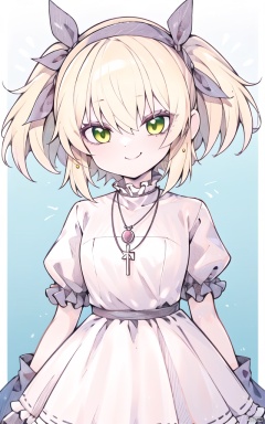 long hair, looking at viewer, smile, short hair, bangs, multiple girls, blonde hair, simple background, shirt, black hair, white background, dress, ribbon, 1girls, hair between eyes, twintails, jewelry, green eyes, hair ribbon, yellow eyes, upper body, short sleeves, hairband, puffy sleeves, necklace, puffy short sleeves, pendant, lolita hairband, frilled hairband, sakurai momoka, matoba risa