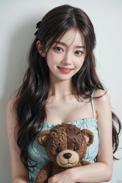 1girl, solo, stuffed toy, stuffed animal, long hair, bow, looking at viewer, hair bow, smile, black hair, ribbon, brown hair, upper body, teddy bear, bangs, mole