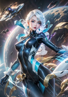 1girl, solo, long hair, breasts, looking at viewer, blue eyes, jewelry, medium breasts, blue hair, weapon, white hair, earrings, lips, bodysuit, space, houtufeng, 1girl