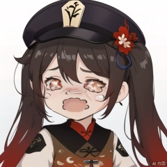 crying, hu tao \(genshin impact\), 1girl, hat, solo, brown hair, smile, jewelry, flower, red eyes, chibi, long sleeves, twintails, long hair, ring, looking at viewer, black nails, symbol-shaped pupils, bangs, bracelet, hat flower, chinese clothes, simple background, sidelocks, gradient, hair between eyes, gradient background, multicolored hair, gradient hair, upper body, black headwear, coat,
