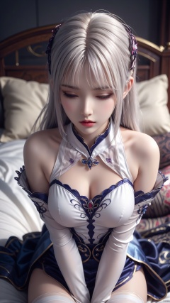 1girl, frown, close eyes, lip apart, white hair, long hair, thighhighs, lying, perfect body, scenery, sharp focus, best quality, masterpiece, detailed outfit, illustration, perfect eyes, finely detailed beautiful anime eyes, realistic skin, intricate details, best lighting, depth of field, ultra high resolution, bed, from above