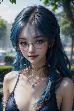 Girl, solo, long hair, chest, looking at the audience, smile, bangs, bare shoulders, jewelry, closed mouth, (blue hair:1.5), collarbone, upper body, braid, outdoor, glasses, necklace, daytime, necklace, eyelashes, blurred background, black necklace, pendant, realistic,babatabule, 1girl