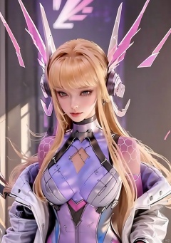 1girl, solo, long hair, breasts, bangs, blonde hair, hair ornament, brown eyes, upper body, sidelocks, bodysuit, hair rings