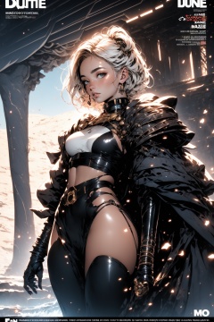 (magazine cover tile with "DUNE":1.5), 1girl, wavy short hair, white hair