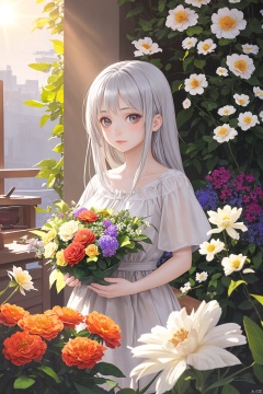 masterpiece,best quality,1girl,silver hair,Still Life,nobody,Product Photography,Sunshine,flowers