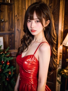 1, 1girl, long hair, brown hair, solo, dress, brown eyes, looking at viewer, holding, red dress, parted lips, bare shoulders, indoors, lips, upper body, sleeveless, ((poakl))