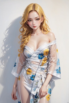 fine art, oil painting, 1girl,white kimono,yukata,white theme.long curly hair,yellow hair,off-shoulder,see through,cowboy shot,
