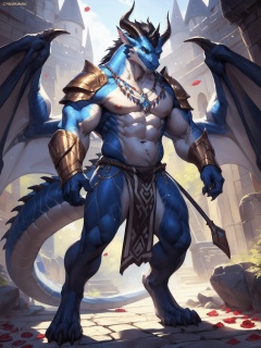 uploaded on e621, (male anthro dragon), standing, solo, muscle, detailed scale texture, old castle, (battlefield), (tribal clothing, ((long loincloth))), (shoulder armor, leg armor), (blue body, white belly), (art by chunie, (drakgem), ((rakisha)), (kontanagamori)), (front view), looking pleasured, [simple background], detailed pupils, masterpiece artwork, caustics, rim lighting, single light source, sharp shadows, solo portrait, (digitigrade), (kemono), by inessa garmash, greg rutkowski, pino daeni, ruan jia, (light particles), rose petals, 2 wings, horn