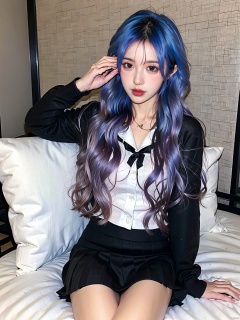 Enhanced, masterpiece, 16K, JK, 1 girl, long hair, school uniform, skirt, sitting on bed,:)
