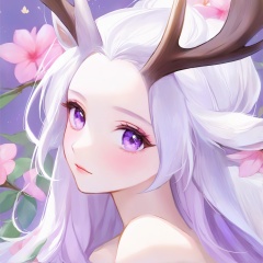 1girl, bare shoulders, collarbone, floral background, flower, long hair, pink flower, purple eyes, solo, white hair,slightly rosy face,Beautiful and delicate eyes,Reduced purple deer antlers