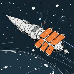 line art style, CDE_spaceship, no humans, star \(sky\), military vehicle, space, vehicle focus, spacecraft, planet, orange tail fin,
