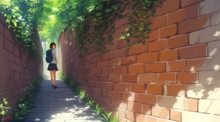 (best quality), ((masterpiece)), (highres), illustration, original, extremely detailed,  <lora:疗愈天空:0.7>1girl, solo, scenery, bag, backpack, sunlight, outdoors, skirt, signature, brick wall, dappled sunlight, short hair, shade, plant, day, tree, standing, wall