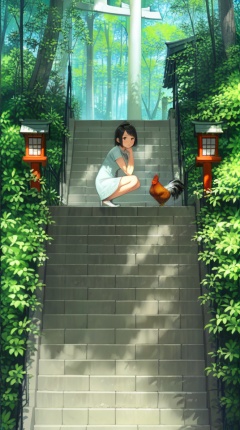 (best quality), ((masterpiece)), (highres), illustration, original, extremely detailed,  <lora:疗愈天空:0.7>1girl, stairs, chicken, dress, bird, squatting, outdoors, black hair, torii, day, short hair, solo, plant, tree, scenery, lantern, nature, white dress, sunlight, stone stairs, white footwear, shrine, dappled sunlight, short sleeves, black eyes, forest, looking at viewer, shade, animal, year of the rooster, shoes