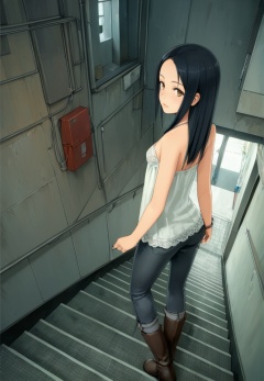 (best quality), ((masterpiece)), (highres), illustration, original, extremely detailed,  <lora:疗愈天空:0.7>1girl, solo, black hair, looking back, long hair, pants, camisole, boots, bare shoulders, looking at viewer, standing, stairs