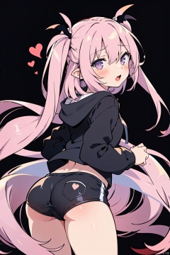 sakyumama, 1girl, solo, hood, looking back, white background, simple background, hoodie, looking at viewer, hood down, open mouth, v, long sleeves, from behind, hair between eyes, ass, heart, hand up, cropped legs, black hoodie, cowboy shot, blush, sleeves past wrists,succubus tail