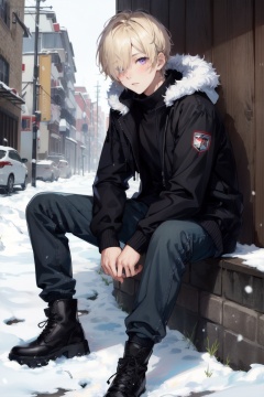 1boy, male focus, blonde hair, solo, sitting, hair over one eye, purple eyes, sweater, pants, hood, boots, jacket, looking at viewer, turtleneck, fur trim, snow, outdoors, turtleneck sweater, black pants, black footwear, snowing, long sleeves, white sweater, hood down, plant