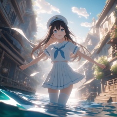 {{{{character focus}}}}, {anime screencap},{{{3d,weak light}}},hidden hands,spread arms,building,((masterpiece)), (((best quality))), ((ultra-detailed)), ((illustration)),{{{1gril}}} ((Long hair)),{{big super detailed eyes}},{{艦隊Collection Style}},Ship anthropomorphism,{{{{No hand is displayed}}}}T shirt,short skirt,Exquisite clothes,Sailor's Hat, white stockings,Happy expression,with a face like a peach blossom,On the ocean,,floating, beautiful detailed sky,Delicate water,Blue sky and white clouds,extremely detailed CG unity 8k wallpaper,The sunlight shining in,dynamic angle,cinematic,lighting,((chromatic aberration)), ((caustic)), beautiful detailed,glow,dynamic angle,depth of field,light_leaks,Amazing,finely,detail,extremely detailed CG,Original,(sunlight),((an extremely,delicate and beautiful)),glowing,bright,{{{bluearchive}}}