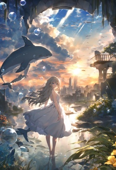 masterpiece, best quality <lora:sd_xl_dpo_lora_v1-128dim:1>,1girl, solo, blue eyes , looking at viewer , white background, long hair, standing, closed mouth, bangs, dress ,cloud, sky, scenery, outdoors, sunset, lens flare, cloudy sky, water, building, sun, horizon, blue sky, sunlight, reflection, city, tree, musical note, outdoors, sky, plant, day, dress, flower, bag, cloud, blue sky, eighth note, grass, white dress, pants, smile, whale, building, fish, underwater, water, ruins, outdoors, light rays, city, dolphin, sunlight, bubble, shark, blue theme, animal, air bubble
