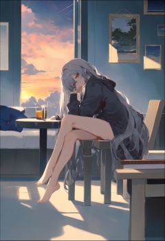 masterpiece, best quality <lora:sd_xl_dpo_lora_v1-128dim:1>,F:\\AIxunlianji\\SWAV\\10 SWAV, 1girl, long hair, solo, barefoot, sitting, looking at viewer, very long hair, indoors, bangs, bare legs , table, long sleeves, hood, hoodie, full body, grey hair, brown eyes, jacket, black hoodie, chair, legs ,sky, cloud, star (sky), border, scenery, outdoors, black border, starry sky, cloudy sky, sunset