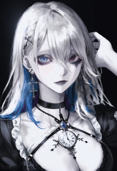 masterpiece, best quality, <lora:sd_xl_dpo_lora_v1-128dim:1> <lora:ABKSKXLlokr3f-000147:1>,1girl, solo, choker, blue eyes, jewelry, earrings, looking at viewer, breasts, watch, parted lips, pocket watch, hair between eyes, cleavage, black choker, hair ornament, heterochromia, black background, cross, white hair, bangs, white skin, colored skin, upper body