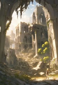 masterpiece, best quality <lora:sd_xl_dpo_lora_v1-128dim:1>,solo, 1girl, blonde hair ,scenery, ruins, solo, tree, building, window