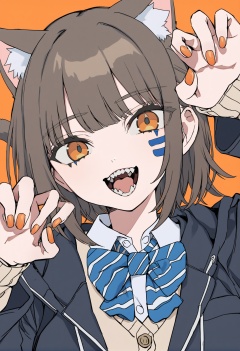 masterpiece, best quality, <lora:sd_xl_dpo_lora_v1-128dim:1>, <lora:hakuhiruoeoeXLlokr-000077:1>1girl, solo, animal ears, bow, teeth, jacket, tail, open mouth, brown hair, orange background, bowtie, orange nails, simple background, cat ears, orange eyes, blue bow, animal ear fluff, cat tail, looking at viewer, upper body, shirt, school uniform, hood, striped bow, striped, white shirt, black jacket, blue bowtie, fingernails, long sleeves, cat girl, bangs, fangs, collared shirt, striped bowtie, short hair, tongue, hoodie, sharp teeth, facial mark, claw pose