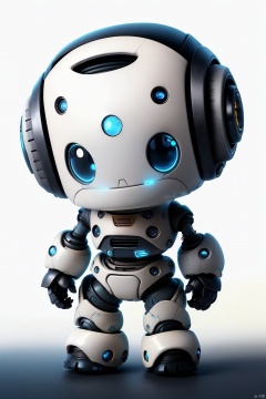 no humans, robot, solo, standing, straight-on, blue eyes, mecha, glowing, white background, full body, science fiction, simple background, glowing eyes, chibi, humanoid robot