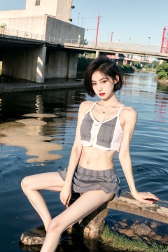 1girl, pale skin,black hair,short-hair,outdoors,sitting, bridge,river,full_body, miniJK,plaid,bare belly, ((poakl))